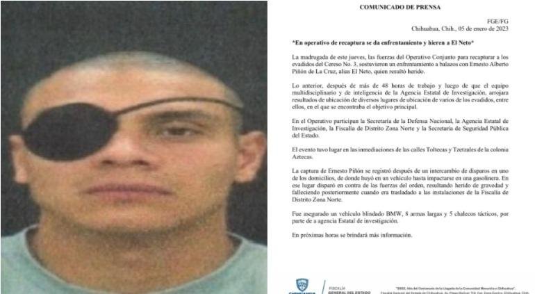 La captura de Ernesto Piñón se registró después de un intercambio de disparos en uno de los domicilios, de donde huyó en un vehículo hasta impactarse en una gasolinera. En ese lugar disparó en contra de las fuerzas del orden, resultando herido de gravedad y falleciendo posteriormente cuando era trasladado a las instalaciones de la Fiscalía de Distrito Zona Norte.