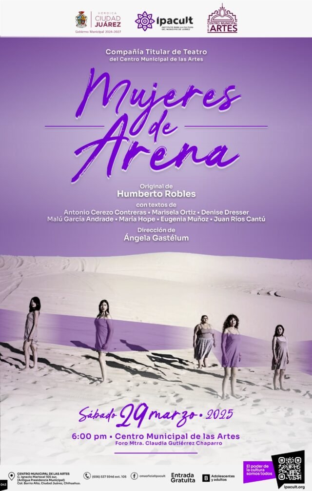 El Instituto para la Cultura del Municipio de Juárez (IPACULT) invita a la ciudadanía a presenciar la tercera presentación de la obra documental Mujeres de Arena, que tendrá lugar el próximo sábado 29 de marzo a las 6:00 de la tarde en el foro “Maestra Claudia Gutiérrez Chaparro” del Centro Municipal de las Artes (CMA).