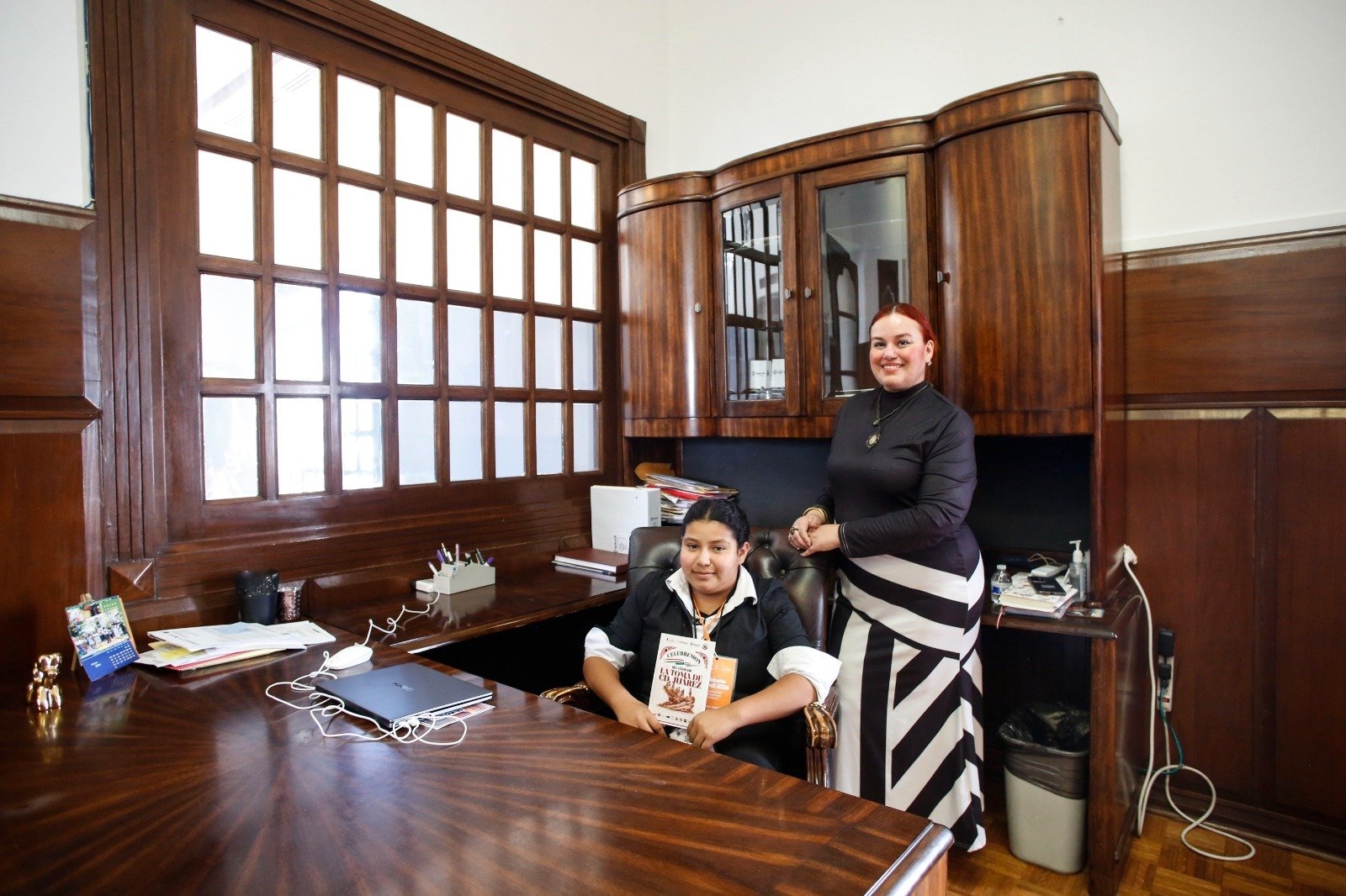 Fátima Albino Rodríguez, de 12 años y estudiante de sexto grado en la Escuela Primaria Pascual Ortiz Rubio, estuvo acompañada por la directora del IPACULT, Ogla Liset Olivas, durante esta significativa experiencia que le permitió conocer de cerca el funcionamiento de la administración pública municipal en el área cultural.