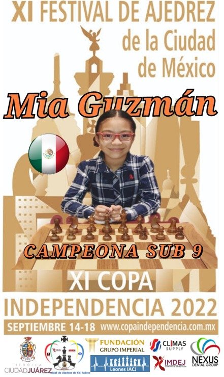 El pasado fin de semana, la ajedrecista Fernanda Mía Guzmán García, logró el primer lugar en la categoría sub 9 dentro del XI Festival Internacional y Nacional Abierto de Ajedrez CDMX Copa Independencia 2022.