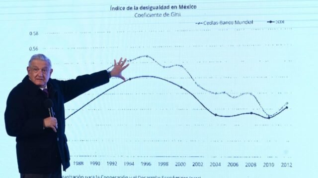 Con una gráfica salida del Banco Mundial y la Organización para la Cooperación y el Desarrollo Económicos (OCDE) AMLO ejemplificó el nivel de la desigualdad del país. Asegurando ahora a pesar del Covid-19 hay menor crecimiento, aunque afirmó lo hay, pero también menos desigualdad.