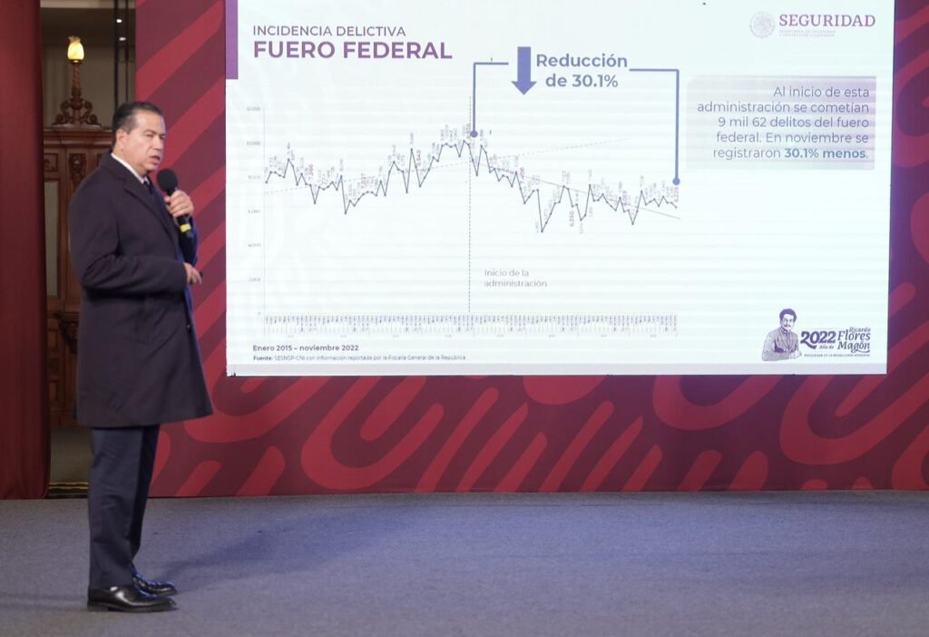 Resaltó que al inicio de esta administración se cometían 9 mil 062 delitos del fuero federal, y en noviembre se contabilizaron 30.1% menos.