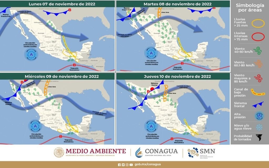 Asimismo, el miércoles 9, se espera escaso potencial de lluvias y ambiente vespertino cálido sobre gran parte del estado, con rachas de viento superiores a los 50 km/h acompañados de tolvaneras.