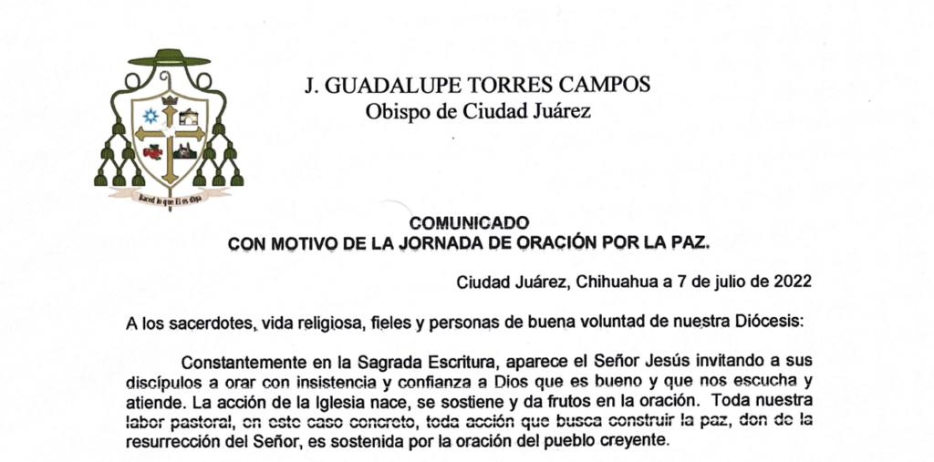 El pasado 7 de julio, J. Guadalupe Torres Campos, Obispo de Ciudad Juárez emitió una carta dirigida a la ciudadanía a orar por la justicia y seguridad en México, así mismo dió una serie de indicaciones para la Diócesis en jornada de oración por la paz.