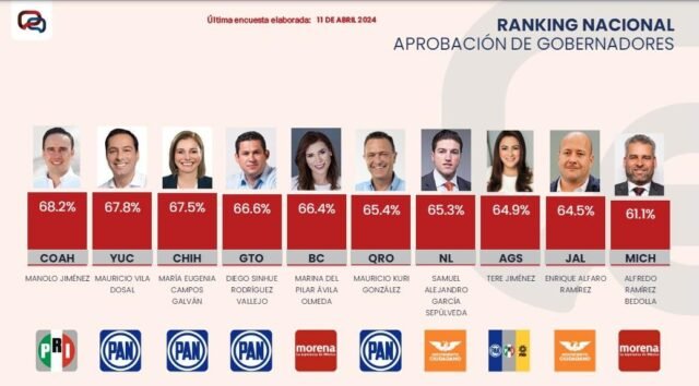 De acuerdo con los resultados del estudio elaborado el 11 de abril, Campos se colocó en la posición número 3 en el ranking nacional de aprobación, con un 67.5 por ciento de aceptación ciudadana, ligeramente por detrás de Mauricio Vila Dosal, de Yucatán y de Manolo Jiménez de Coahuila.