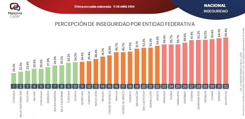 En cuando a la percepción de inseguridad, la entidad no solo ha permanecido dentro de los índices más bajos del país durante 2024, sino que han disminuido de enero a la fecha, al pasar del lugar 6 al 5.