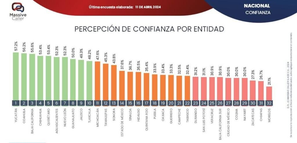 Además se ubicó en el lugar número 4 del rubro de percepción de confianza, con un índice del 53.4 por ciento.
