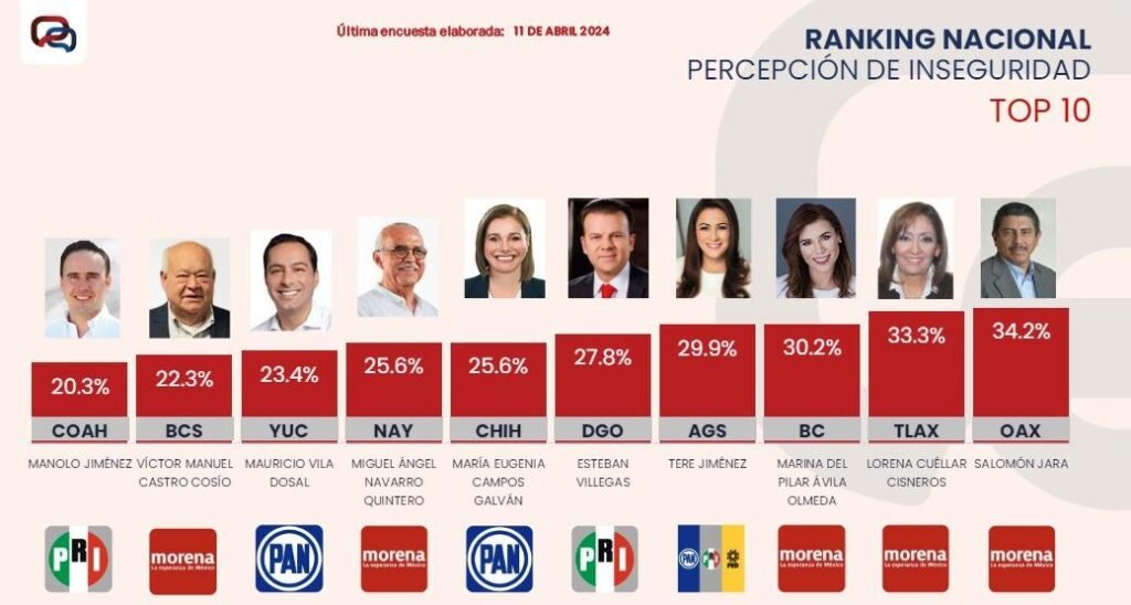 En cuanto a las entidades federativas con menor percepción de inseguridad, la ciudadanía ubicó a Chihuahua en el puesto número 5, con un 25.6 por ciento; en este tema, el estado es el único de los posicionados en el Top 5, que mejoró sus resultados con respecto al mes anterior.