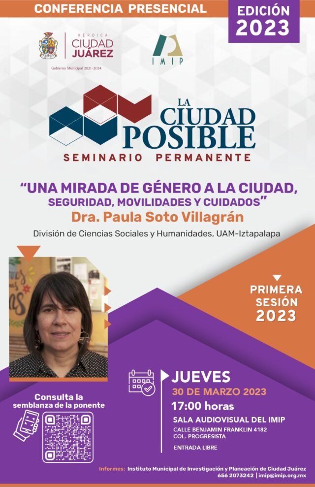 Este jueves 30 de marzo en punto de las 17:00 horas se llevará a cabo la charla “Una mirada de género a la ciudad, seguridad, movilidades y cuidados”, que organiza el Instituto Municipal de Investigación y Planeación (IMIP) como parte de su seminario permanente “La Ciudad Posible”.