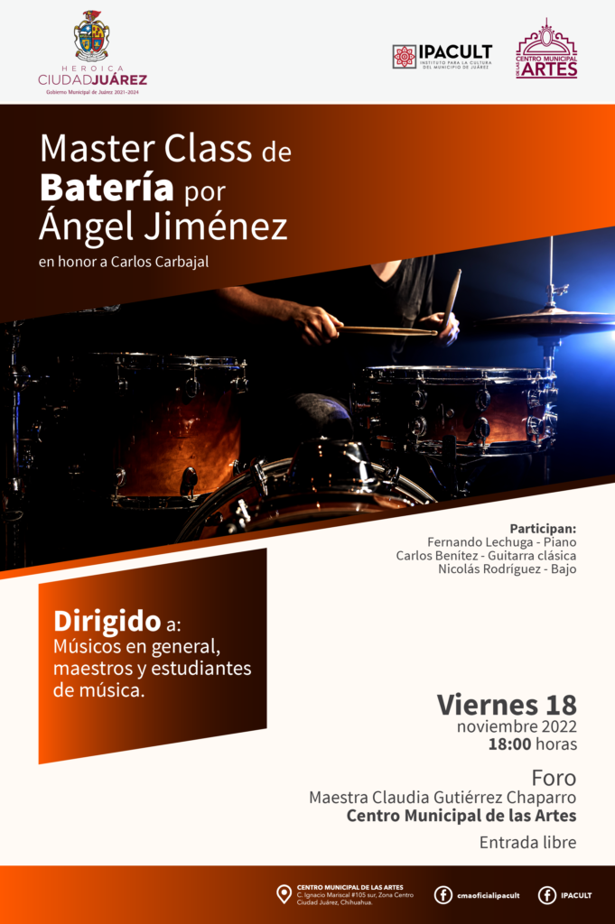 Mañana viernes, a las 6:00 de la tarde se llevará a cabo en el foro “Claudia Gutiérrez Chaparro” del Centro Municipal de las Artes (CMA), la Clase Magistral de Batería por Ángel Jiménez, en honor a Carlos Carbajal.