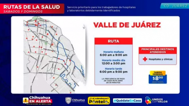 Mientras que para Ciudad Juárez se dejaron seis rutas que trabajarán todas con los mismos horarios: por las mañanas de 6:00 a 9:00; a medio día de 12:00 a 15:00 y por las tardes de 18:00 pm a 21:00 horas.