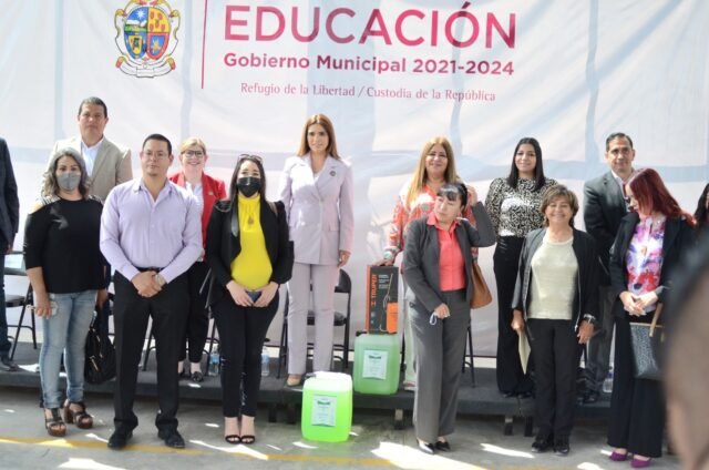 Con la presencia de los estudiantes de la Secundaria número 86, y con la participación de la escolta y banda de guerra de la Secretaría de Seguridad Pública Municipal (SSPM), se llevaron a cabo los honores a la enseña patria y posteriormente se entregaron de manera simbólica los apoyos de desinfectante a los directores de cada una de las escuelas.