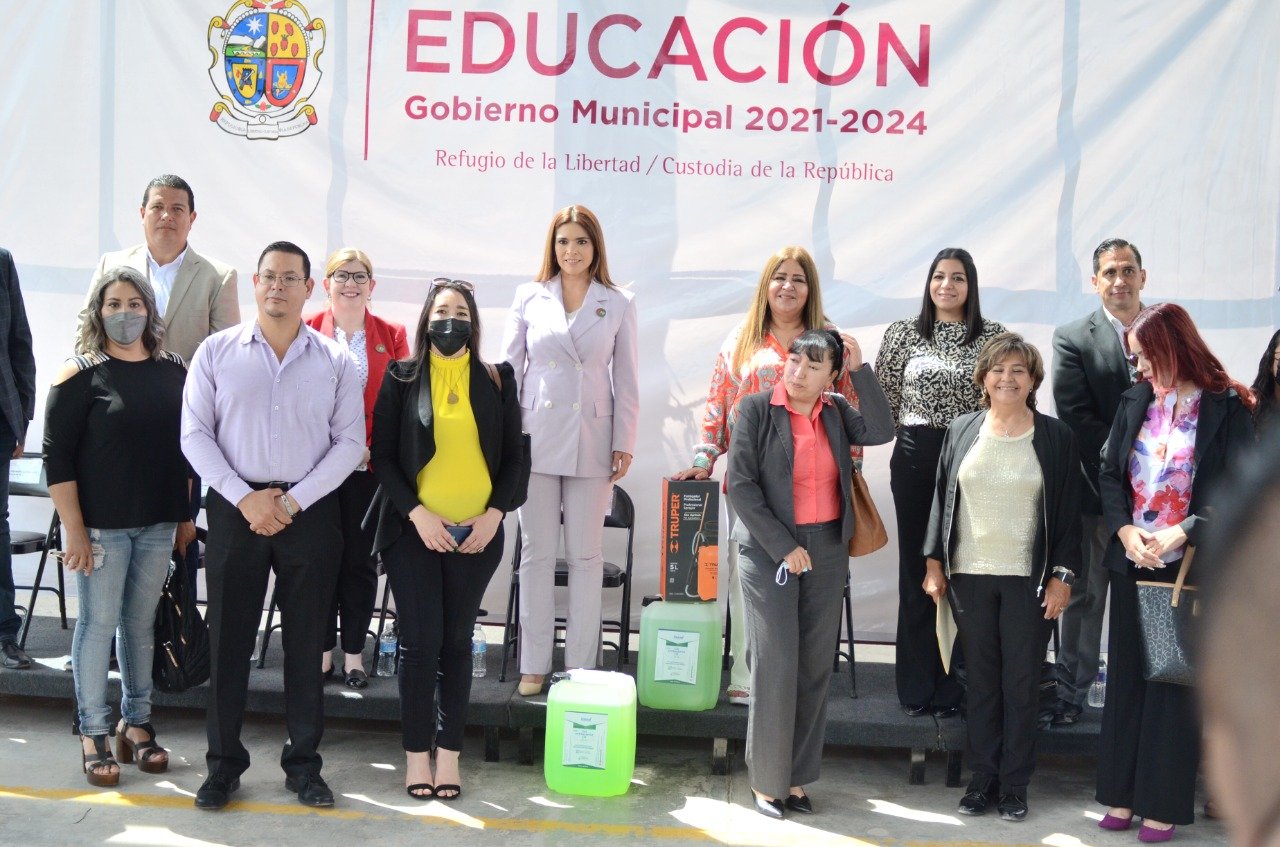 Con el propósito de fomentar los valores patrios, el Gobierno Municipal, a través de la Dirección de Educación, llevó a cabo este día el evento de izamiento de bandera en la Escuela Secundaria Técnica 86, en donde además entregó equipo para desinfectar a 30 instituciones educativas, en su mayoría escuelas primarias.