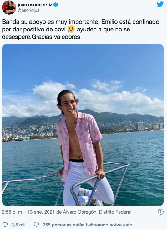 Fue a través de su cuenta en la red social Twitter donde publicó una foto de Emilio con el siguiente mensaje: “Banda su apoyo es muy importante, Emilio está confinado por dar positivo de covi ayuden a que no se desespere.Gracias valedores”.
