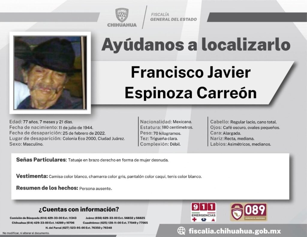 Familiares piden ayuda para localizar al señor Francisco Javier Espinoza Carreón, el lugar de desaparición fue en la Colonia Eco 2000 portaba con camisa color blanca, chamarra color gris, pantalón color caqui y tenis color blanco.
