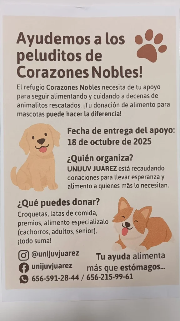 La Asociación Unidad Juvenil de Ciudad Juárez (Unijuv), está recaudando donaciones para el refugio de animales Corazones Nobles, quienes necesitan del apoyo de la comunidad para seguir cuidando y alimentando a animalitos rescatados.