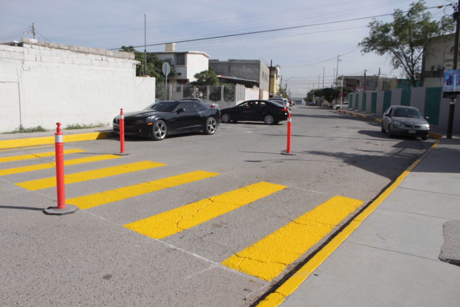 Personal de la Coordinación General de Seguridad Vial pintó hoy los señalamientos viales en el Conalep II, ubicado en calle Enebro 5650 de la colonia Ampliación Aeropuerto, entre Paseo de la Victoria y calle Manuel J. Clouthier.