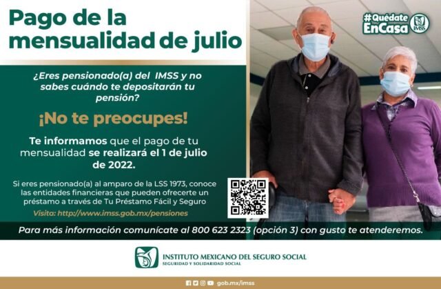 El Instituto Mexicano del Seguro Social (IMSS) informa a la población pensionada que el 1 de julio de 2022 se realizará el pago de la pensión correspondiente a dicho mes.