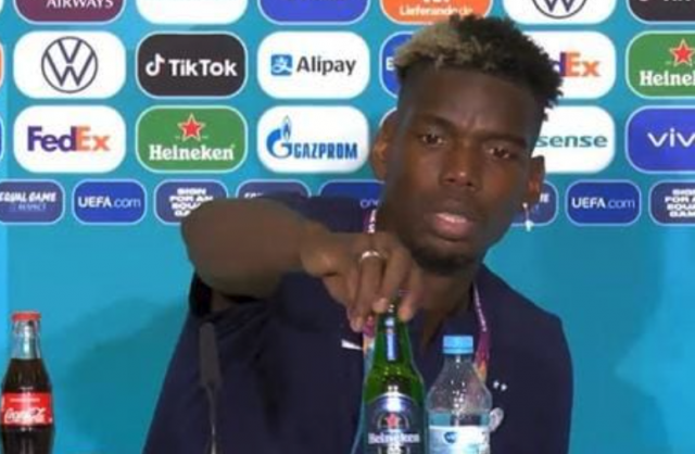 Después del partido de Francia vs Alemania, que ganaron los franceses, Paul Pogba fue a conferencia de prensa e igual que Cristiano Ronaldo con la Coca-Cola, retiró una botella de cerveza Heineken.
