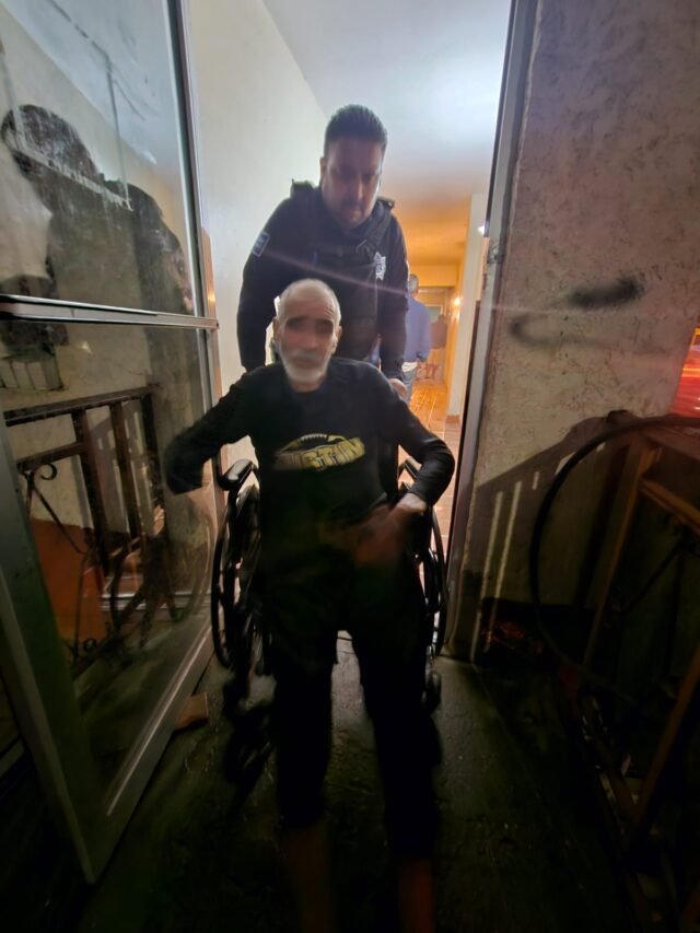 Elementos de la Secretaría de Seguridad Pública Municipal adscritos de la Estación de Policía del Distrito Universidad, auxiliaron a un hombre de la tercera edad en silla de ruedas para ponerlo a salvo durante un incendio.
