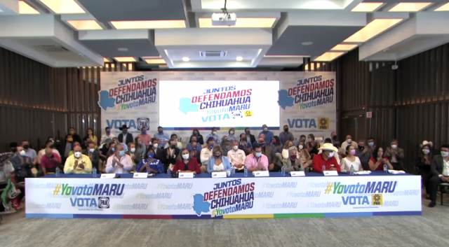 Maru campos acompañada de los ex candidatos a la gubernatura Graciela Ortiz del PRI, Alejandro Díaz de Fuerza por México y Maru Baeza del Partido Redes Sociales Progresistas presentaron el bloque llamado “Juntos Defendemos Chihuahua”.