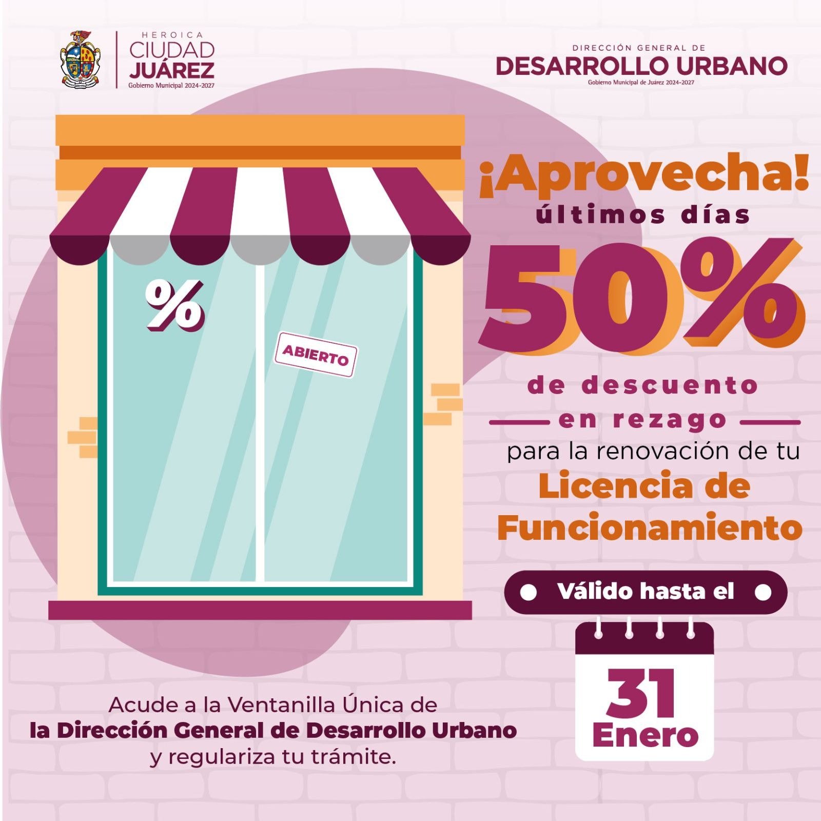La Dirección General de Desarrollo Urbano da a conocer que el próximo 31 de enero vence el plazo para aprovechar el descuento del 50% en recargos en la renovación de la Licencia de Funcionamiento, beneficio dirigido a comerciantes y empresarios que buscan regularizar su situación durante este inicio de año.