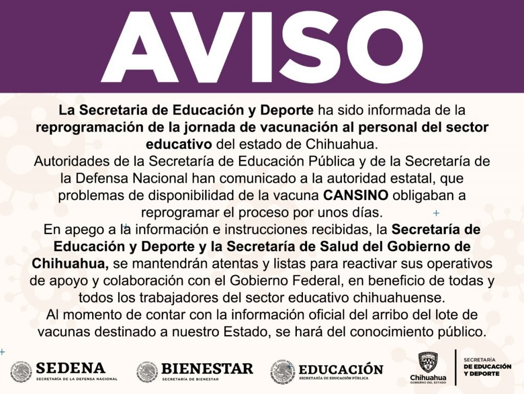 “En apego a la información e instrucciones recibidas, la Secretaría de Educación y Deporte y la Secretaría de Salud del Gobierno de Chihuahua, se mantendrán atentas y listas para reactivar sus operativos de apoyo y colaboración con el Gobierno Federal, en beneficio de todas y todos los trabajadores del sector educativo chihuahuense. Al momento de contar con la información oficial del arribo del lote de vacunas destinado a nuestro estado, se hará del conocimiento público”, señaló la secretaría a través de un comunicado de prensa.