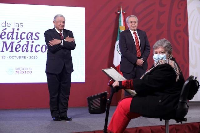Ramírez Pineda felicitó de manera especial a la doctora Aura Argentina Erazo Valle Solís, oncóloga médica del Centro Médico Nacional “20 de Noviembre”, quien esta mañana, en Palacio Nacional, recibió el Premio al Mérito Médico 2020 por parte del Presidente Andrés Manuel López Obrador y del Secretario de Salud y presidente del Consejo de Salubridad General, Jorge Alcocer Varela.