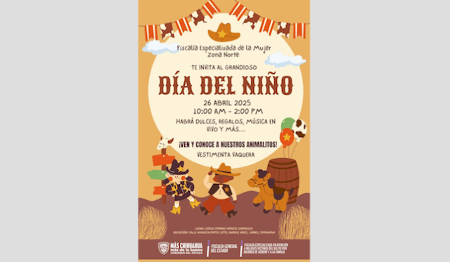 La Fiscalía Especializada en Atención a Mujeres Víctimas del Delito por Razones de Género y a la Familia Zona Norte, realizará el festejo del “Día del Niño” con temática vaquero, en donde todos los niños y niñas están invitados a disfrutar de comida, dulces, música en vivo y muchas sorpresas más.