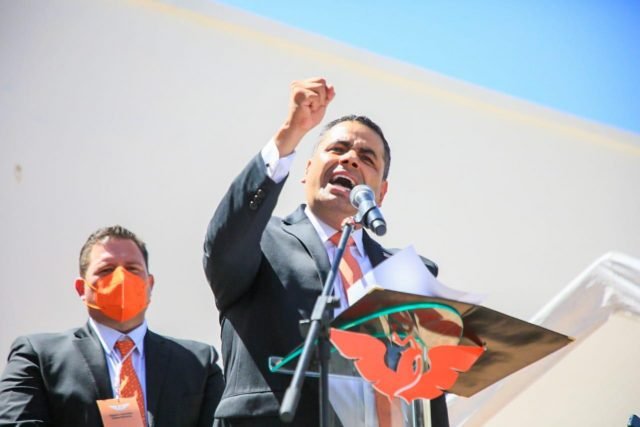 El candidato acompañado de su esposa Sol Sànchez, sus hijos Braulio, luisa Fernanda y Alfredito Lozoya Sànchez, asì como del presidente del Consejo Nacional de Movimiento Ciudadano, Senador Dante Delgado Rannauro, emotiò su mensaje ante simpatizantes y militantes del partido.