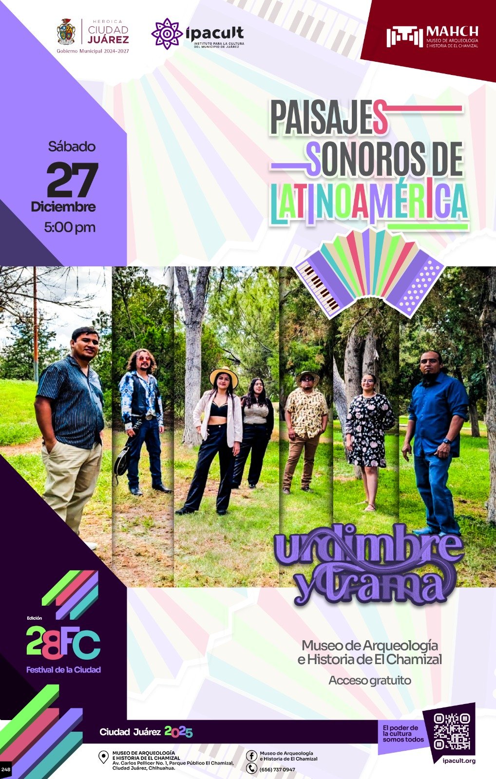 El Instituto para la Cultura del Municipio de Juárez (IPACULT) invita al público a la presentación del grupo musical Urdimbre y Trama, como parte de la exposición “Paisajes Sonoros de Latinoamérica”, que se llevará a cabo mañana sábado 27 de diciembre a las 5:00 de la tarde, en el Museo de Arqueología e Historia de El Chamizal.
