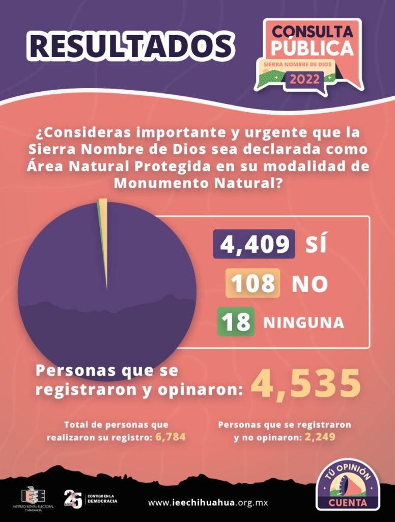 El objeto de la Consulta Pública, solicitada por el colectivo Salvemos los Cerros de Chihuahua y convocada por el IEE es que las personas habitantes de los municipios de Aldama, Aquiles Serdán, Chihuahua y Rosales, relacionados territorialmente con el área del problema social a resolver, expresaran sus opiniones, recomendaciones, comentarios y/o propuestas sobre la importancia y urgencia de que se instituya como tema prioritario para Gobierno Estatal, que la Sierra de Nombre de Dios sea declarada como área natural protegida, en su modalidad de monumento natural.