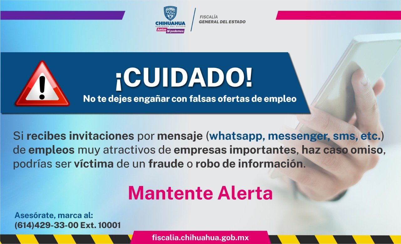 La Fiscalía General del Estado, a través de la Dirección de Análisis de Evidencia Digital e Informática Forense, previene a la ciudadanía para que evite ser víctima de falsas ofertas de empleo a través de redes sociales.