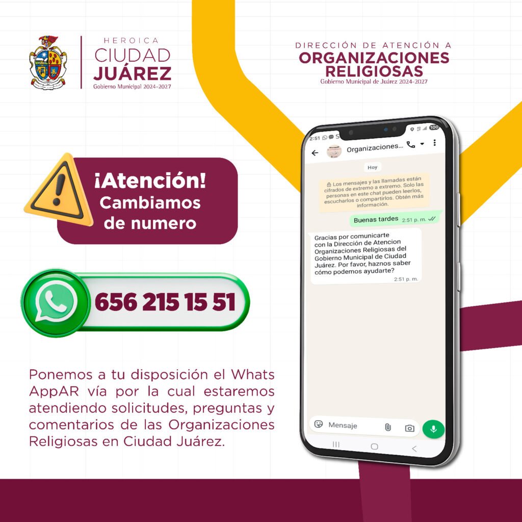 El Gobierno Municipal reitera la invitación a las organizaciones de fe a hacer uso de WhatsAppAR, marcando al 656-215-1551, para resolver dudas y dar seguimiento a sus trámites de forma rápida y sencilla.