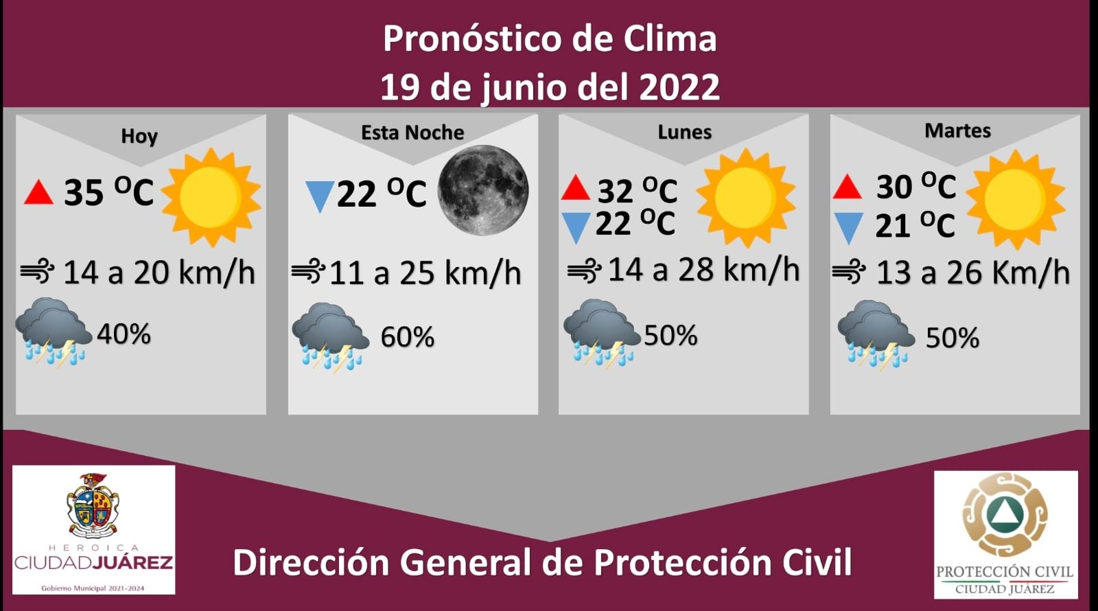 El martes se espera parcialmente nublado, también con una probabilidad de lluvia de un 50 por ciento, la temperatura máxima será de 30 °C, mientras que la mínima se espera en 21 °C, la velocidad del viento oscilará de 13 a 26 kilómetros por hora.