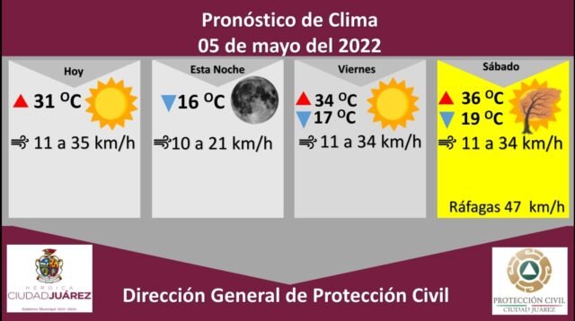 El sábado se emitirá una alerta amarilla debido a ráfagas de viento de hasta 47 kilómetros por hora, la temperatura máxima se espera en los 36 °C, mientras que la mínima se pronostica de 19 °C, será un día soleado con vientos que oscilarán de 11 a 34 kilómetros por hora.