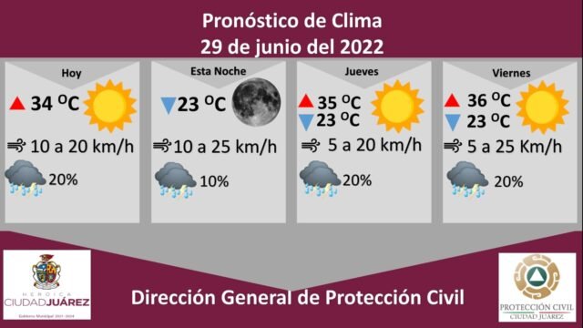 La Dirección General de Protección Civil, de acuerdo al reporte del Servicio Meteorológico Nacional, pronostica una temperatura máxima de 34 grados Celsius, además existe un 20 por ciento de probabilidad de lluvia y tormentas eléctricas, las cuales disminuyen a un 10 por ciento por la noche.