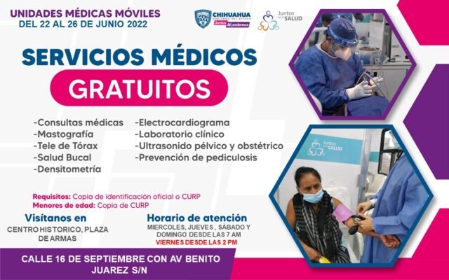 El Gobierno del Estado, a través del programa “Juntos por la Salud”, se encuentra realizando servicios médicos gratuitos los cuales continuarán hasta el próximo domingo 26, en el Centro Histórico de Ciudad Juárez, específicamente en la Plaza de Armas.