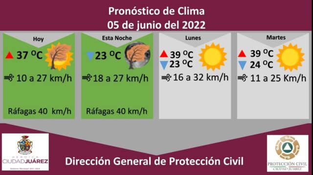 El martes se espera un día soleado, con una temperatura máxima de 39 °C, en tanto que la mínima será de 24 °C, la velocidad del viento se pronostica entre los 11 y 25 kilómetros por hora.