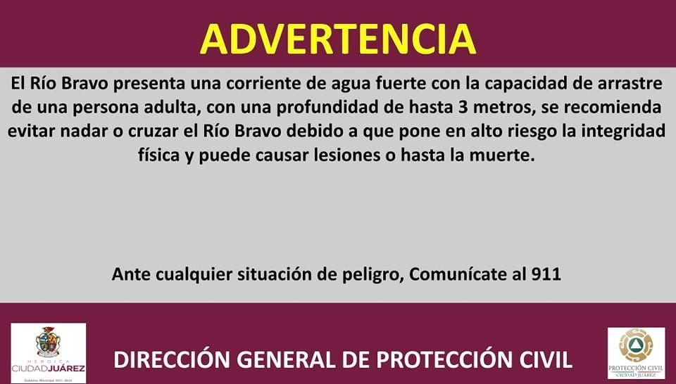 La Dirección General de Protección Civil exhorta a la población en general a no ingresar al río Bravo, ya que las corrientes internas y el fango representan un peligro para quien ingresa al cuerpo de agua, mencionó Roberto Briones Mota, titular de la dependencia.