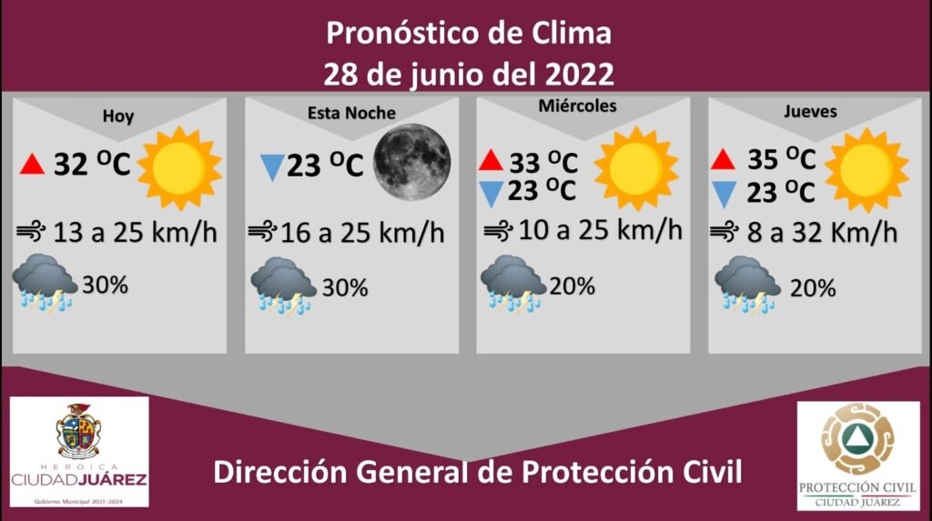 Para mañana miércoles se espera un día soleado, la temperatura máxima será de 33 °C, mientras que la mínima se espera en los 23 °C, la velocidad del aire se pronostica entre 10 y 25 kilómetros por hora, existe una probabilidad de lluvia de un 20 por ciento.