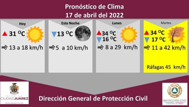 Para mañana lunes se espera un día soleado, la temperatura máxima será de 34 °C, mientras que la mínima se espera en los 16 °C, con una velocidad del viento de 8 a 29 kilómetros por hora durante el transcurso del día.
