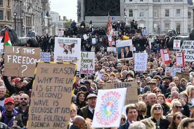 La policía local dijo que unas 400 personas se reunieron en College Green al mediodía del sábado antes de marchar por el centro de la ciudad en protesta por las medidas de confinamiento, dijo el periódico Evening Standard con sede en Londres.