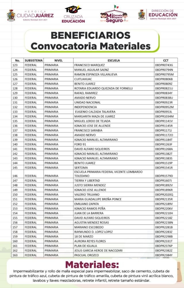 Quien desee conocer la lista de escuelas beneficiadas puede consultarlo a través de la Página de Facebook “Dirección de Educación de Ciudad Juárez”.
