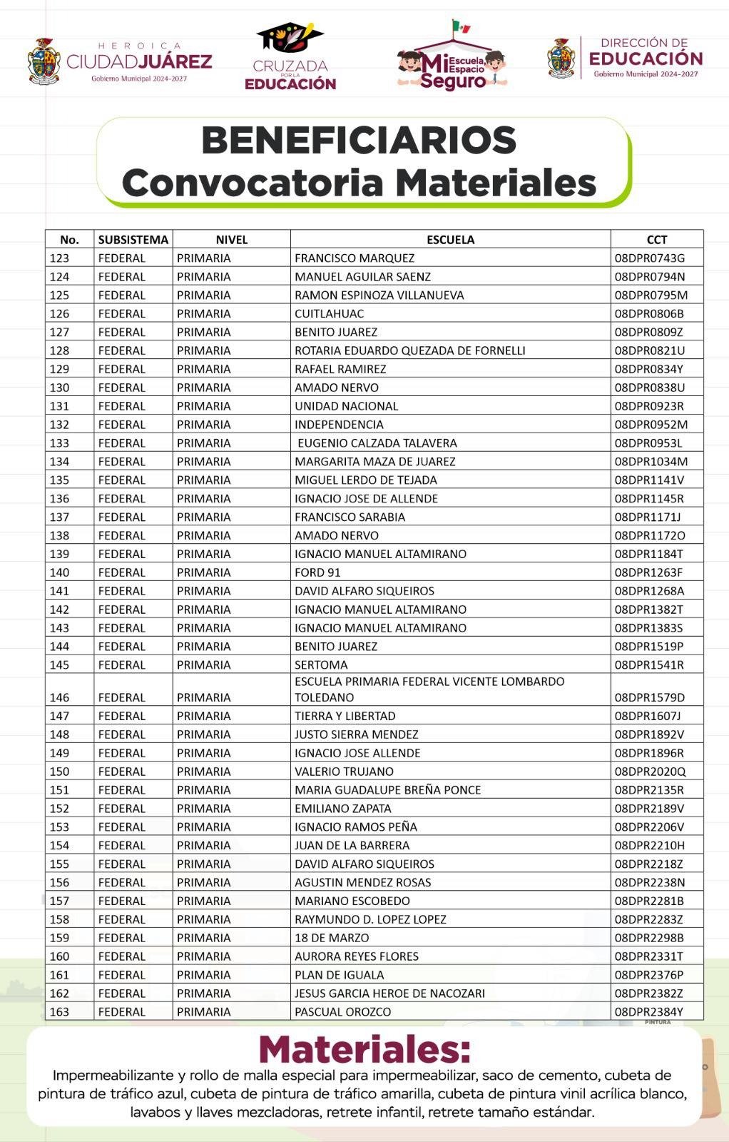 Guillermo Alvídrez Olivas, titular de la dependencia, dio a conocer que las escuelas que resultaron beneficiadas con la convocatoria recibirán material como: impermeabilizantes y rollos de malla, sacos de cemento, cubetas de pintura de tráfico azul o amarilla, cubetas de pintura vinil acrílica blanca, lavabos y llaves mezcladoras, retretes infantiles y retretes tamaño estándar.