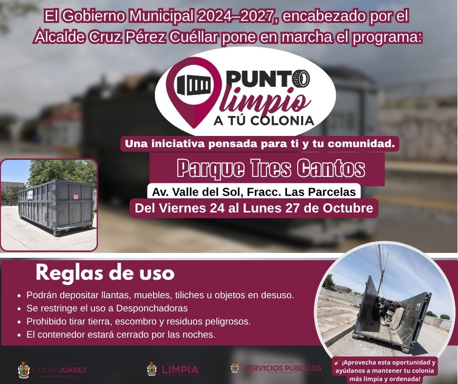 Desde este viernes 25 al lunes 27 de octubre, el programa “Punto Limpio a tu Colonia” estará disponible en tres ubicaciones de la ciudad para que los juarenses puedan disponer de manera responsable de residuos voluminosos.