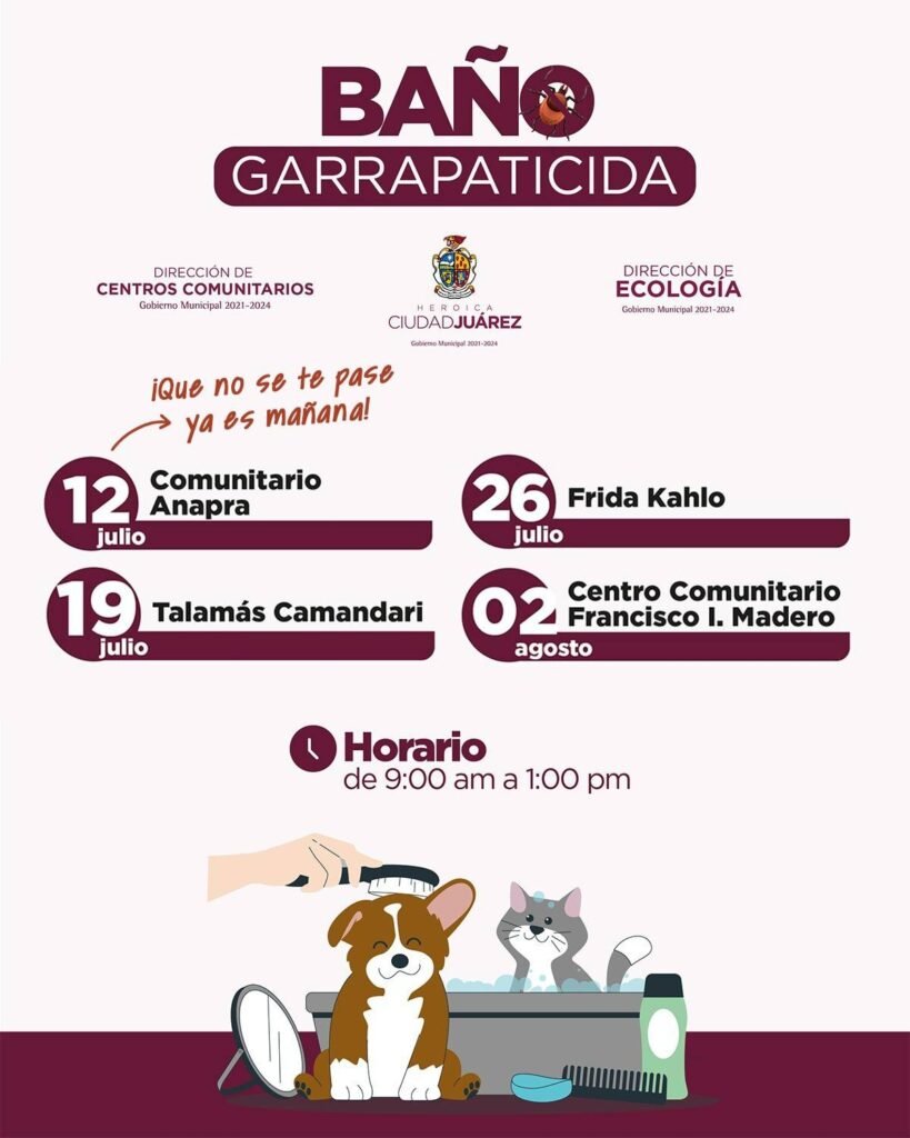 La Dirección de Ecología invita a los juarenses que habitan en el poniente de la ciudad, a llevar a sus mascotas a la brigada de baños garrapaticidas que se realizará en el Centro Comunitario Anapra.