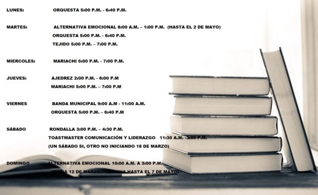 Los jueves se imparte el taller de ajedrez, a las 6:00 de la tarde y los días viernes ensayan los integrantes de la banda municipal, en horario de 9:00 a 11:00 de la mañana.