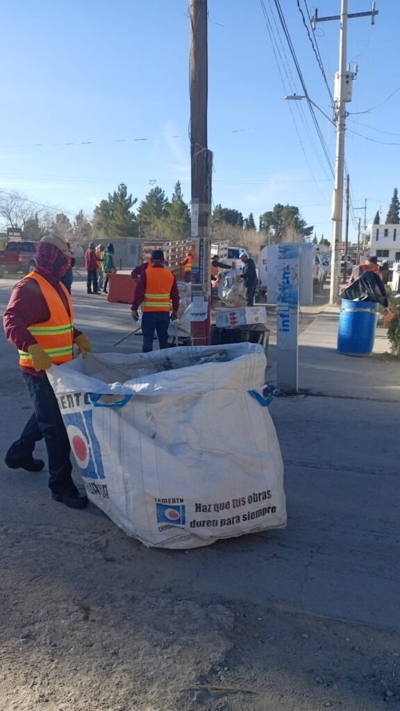 Las cuadrillas de la Dirección de Limpia llevan a cabo labores de limpieza en el ejido Samalayuca, luego de los festejos realizados en la comunidad el fin de semana, los cuales generaron acumulación de residuos.