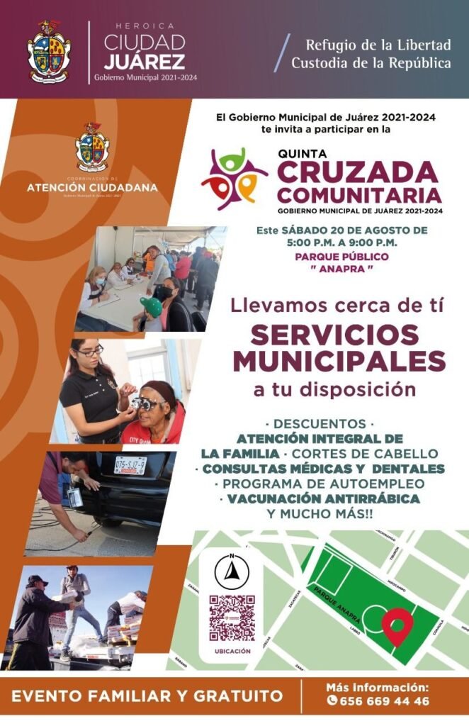 La Dirección de Atención Ciudadana dio a conocer que el próximo sábado 20 de agosto se llevará a cabo la quinta Cruzada Comunitaria en el parque público de la colonia Anapra, donde más de 40 dependencias municipales estarán ofreciendo más de 250 trámites y servicios.